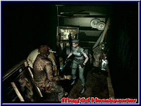 Rechts ist die einzige Tür wo ich weiter kann. Rein geht's. Und siehe da, die altbekannten Ladebildschirme beim Betreten eines neuen Raumes. Sie gibt es auch auf dem GameCube. Ja was für ein Bild. Über mir eine hell leuchtende Lampe die nur meinen unmittelbaren Teil erleuchtet. Der Rest ein Gang hinter wie vor mir, der immer dunkler zu werden scheint. Dazu ein Sound hier, der klingt als wenn ein Herzschlag überminensional lauter wird. Fehlt nur noch das erste stöhnen. Zumindest gehe ich nach vorn in den Gang der leer ist. Dafür sehe ich links zwei Türen, die sich aber nicht öffnen lassen. Stattdessen bekomme ich Hinweise auf ein Emblem, das am Schloß eingeritzt ist. Allerdings ein Rüstungs Emblem. Wäre wohl auch ein wenig unlogisch eine Tür mit einem Emblem zu öffnen. Am Ende komme ich an eine Treppe und einen Fahrstuhl den ich aber nicht nutzen kann. Zumindest nicht von diesem Stockwerk. Also die Treppe nach unten. Hey man sehen die Wände echt aus. Bröckelnde Farbe, Putz und halbabgerissene Tapeten. Na wenn das nicht heimelig ist. Unten ist auch nur eine Tür die mir wieder verschlossen den Hinweis mit einem Emblem gibt. Eingeritzt am Schloß ist hier nun der Hinweis auf ein Schwert. Ok also wieder hoch und im Gang auf die andere Seite bei meinem Lämpchen nach dem Kamin Raum. Obwohl mein Kaffee könnte durch sein. Nervennahrung die nie schlecht sein kann. Also kurze Pause...... Dazu noch was für die Lunge tun und weiter geht's. Übrigens weil wir gerade dabei sind. Im Pausenmenu könnt Ihr die Steuerung als auch die Helligkeit ebenfalls direkt im Spiel anpassen. So, nun auf der anderen Seite weiter. Na Klasse, besonders hell ist es da auch nicht gerade. Klasse ist der Schatten von Jill der sich 1:1 mit ihren Atembewegungen mitbewegt. Details die das Spielerauge erfreuen. An der Ecke geht's rechts weiter und der Bildschirm wird dunkel. Willkommen in meinem Reich könnte man denken. Ein schmatzender Zombie, was übrigens voll gezeigt wird knabbert an einem weiteren Team Mitglied herum. Bis er sich langsam umdreht und mich entdeckt. Mein erster Kampf!!! Bloß schnell weg. Und sage ich es nicht. Renne fast in die falsche Richtung. Heiliger, bloß keine Hektik Jill. Erstmal wieder in den Gang wo ich ihn kommen sehen kann und erstmal 8 Schuß auf ihn gefeuert. Gott wie das Blut spritzt. Sagenhaft!. Verzeiht mir die eine oder andere verbale Geschmacklosigkeit. Ich glaube Ihr wißt wie ihr das einzuschätzen habt. Erst nach 10 Schuß liegt der gute am Boden. Na aber Hallo. 2 Drittel meines Magazines weg und gerade mal ein Zombie tot. Aber ihre roten Bluttlachen sind nach wie vor das Zeichen des dahinscheidens. Ok, gehen wir nun zu dem Typen an dem er herumgeknabbert hat. Wie immer alles untersuchen und ich finden ein Kassette. Brauche ich nur noch einen Player. Hier hinten ist auch noch eine Tür. Allerdings bekomme ich jetzt den Hinweis doch wieder zu Wesker zu gehen und zu berichten. |