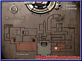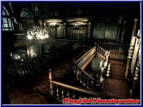 Ich glaube es ist doch noch zu leise in meinem Zimmer. ;-) Der vor mir stehende Tisch mit seiner leicht spiegelnden Oberfläche bringt mich zu einem wichtigen Thema. Denn direkt hier kann ich die ersten Ribbon's einsammelm. 3 Stück, die ich zum speichern benötige. Fehlt eigenlich nur noch eine Schreibmaschine. Meist in der Nähe finde ich sie auch schon. Im Inventury Menu das ich erstmal begutachte finden sich nun 8 Plätze wieder an denen ich Items aufnehmen kann. Vom 2er kennt man man noch die Combine und Use Befehle. Mir neu ist der Punkt Defense hier, der noch leer ist. Dafür sehe ich das Jill mit Pistole startet und ein Messer besitzt. 15 Schuß. Gehe ich von alten Spielen aus war das eigentlich ein Affenfurz in einem Spiel wie diesem. Zu allem was ich hier tue läuft übrigens eine herrlich mystische Musik, die wen wunderts zum aktuellen Geschehen paßt. Dazu finde ich hier die Karte die ich aber auch schnell per Z Taste aufrufen kann. Der Querschnitt der Etage mit den Türen. Rot für geschlossen und blau für offen und durchlaufen. Aber wieder zurück in's Spiel. Wo ist eigentlich mein Begleiter hin? Erstmal mache ich meinen ersten Kontakt mit der Steuerung. Ach Du heiliger. Das Wort ungewohnt ist gnädig , dem was ich hier mache. So definiere ich mit dem 3D-Stick meine Laufrichtungen. Kurios das egal wie rum ich stehe nach oben drücken immer vorwärts bedeutet. Ich seh mich schon in hektischen Situationen den Gegner umarmen statt abzuhauen. Nun doch nochmal einen Blick in's Handbuch geworfen. Halte ich B gedrückt renne ich anstatt langsam zu laufen. Mit R gehe ich in Schußposition, oder mit was auch immer ich gerade kämpfe. A um die Waffe zu nutzen. Jungs, geht nicht noch eine Spur komplizierter? Ich könnte auch mit dem Steuerkreuz spielen, aber das ist mir noch ungewohnter. Mit dem C-Stick mache ich ein schnelle 180 Grad Drehung. Naja, wenigstens mal was sinnvolles. Also so richtig hat mich die Steuerung noch nicht überzeugt. Aber das war beim Bond anfänglich ähnlich. Ich gehe weiter den Weg hier entlang und komme an einer Uhr vorbei die mir etwas von 2 Uhr erzählt und stehe danach vor einem Bild mit 2 kämpfenden Rittern. Nur keinen Hinweis übersehen rede ich mir ein. Mal schauen wie ehr der Grips hier gefordert wird. Die Kamera geht genauso über wie in den alten Evil Spielen. Ruckzuck sind wie im nächsten Bereich des Zimmers und ich sehe Barry wieder, der an einer roten Flüssigkeit nippt. Als ob wir nicht alle wüßten was das ist. Aber leck nur Bursche, wenn's schmeckt. Danach soll ich allein weiter schauen. Na dann Jill. Wollen wir mal. Moment mal...., hier am Kamin kann ich ebenfalls etwas untersuchen und kann hier über dem Kamin ein Emblem einstecken. Sieht aus wie das Schild eine Ritters. Sehr schön das ich im Menu jedes Items drehen, wenden und zoomen kann. Hilft mir zwar nicht die Inschrift auf dem Emblem zu lesen, aber könnte irgendwann sicher nicht schaden. Also dann.