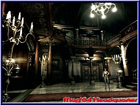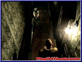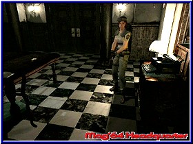 Also zurück und in der nächsten Sequenz erledigt mein Begleiter einen weiteren Zombie. Nett sehen die Jungs aus. ;-) Ok wieder zurück zur Haupthalle. Ich überlege ob ich jetzt schon speichern sollte. 3x könnte ich ja. 5 Schuß....., aber noch bester Gesundheit...., ich lasse es erstmal. Genau beim verlassen schwenkt die Kamera nochmal an das Ende des Raumes und man hört den Zombie wieder stöhnen. Und schwupps, schon sind wir wieder in der Haupthalle. Stehen die Burschen etwa wieder auf? Allein der Gedanke verschafft mir eine Gänsehaut. In der Haupthalle ist nun Wesker allerdings verschwunden. Da waren es nur noch 2. Diesmal soll ich allein die erste Etage untersuchen während Barry weiter unten wartet. Ich glaube man braucht kein Hellseher zu sein wer nicht mehr da ist wenn ich wiederkomme. OK Jill, dann wollen wir mal nach oben schauen mit unseren 5 Schuß. Schon auf der Treppenhälfte ist so etwas wie eine Tür zu sehen. Aber benutzen kann ich sie nicht. Ich bekommen den Hinweis erst die Halle zu durchsuchen. Ob angekommen stehen erneut einige Türen zur Auswahl. Aber mir wird die Wahl abgenommen. Überall kommt der Hinweis nach dem absuchen der Halle. Also wieder nach unten. Sieh an, mein Begleiter ist doch noch da. In der nächsten Sequenz trennen sich aber die Wege. Er will erneut in den Speisesaal, während ich hier unten gegenüber in die Tür soll. Als letztes bekomme ich neben guten Wünschen einen Lock Pick, mit dem ich wohl Schlösser öffnen werde. Gut zu wissen. Die Grafik geht wieder in's Spiel und ich bin nun allein. Mir juckt es ja in den Fingern nach oben zu gehen. Soviele Türen und so wenig Munition. ;-) Also gehe ich hier unten doch erstmal in die Tür wie angekündigt. Ebenfalls eine große wie die vom Speisesaal. Was wird mich wohl erwarten? Unter seichten und heroischen Geigenklängen erreiche ich einen kleinen Raum mit einer Statue und sehe schnell was nötig ist. Oben drin blinkt etwas, das ich wohl holen muß. Die Statue schieben kann ich nicht. Bei meinem Blick umher sehe ich eine Tür, die erneut mit einem Schwert Emblem darauf hinweist was ich hier später brauche. Hinten links ist ein Nebenraum hinter einer Kommode. Moment mal, vielleicht kann ich die Kommode bewegen. Zumindest das einzige das mir logisch erscheint. Also drauf geklettert und auf der anderen Seite nach unten. Was für ein Raum dahinter. Mit weißen Laken abgedeckte Möbel und einem Kerzenschein der hier ein Licht rein wirft. Gänsehaut, du mußt Dich nicht schämen. Wie ein Stilleben, wo man denkt das jede Sekunde irgendwo was rauskommen könnte. Irres Feeling. Dazu diese Klänge. Ich liebe diese Spiele. OK, genug den Gedanken nachgehangen. Wieder zur Kommode und ich kann sie tatsächlich schieben. Bis vor die Statue und ich finde die Karte für den 1 Floor. Sind doch einige Räume mehr als gedacht. Ich sehe auch das es in meinem kleinen Raum hier um die Ecke gehen muß. Jetzt entscheide ich mich doch erstmal für's speichern.