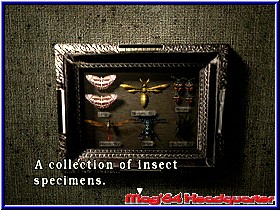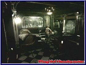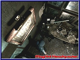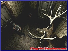Auch einen Schalter an einem der Rahmen, der aber nichts bewirkt wenn ich ihn drücke. Hmmmm.., zumindest packe ich aber jetzt den Angelhaken ein. Denn das Aquarium ist doch auch nicht umsonst aktiv. Dürfte eigentlich kein Problem sein Haken und Köder irgendwie zusammenzubringen. Nur warum gibt es 2 verschiedene Köder? Vor allem ich kann beide abnehmen und auch jeweils auf die anderen Rahmen hängen. Also praktisch tauschen. Ich weiß nicht wie oft ich es hin und her gemacht habe. Mit Haken und ohne, doch auf einmal passiert etwas. Nämlich nach dem Schalter drücken öffnet sich ein Fach und etwas gelbes ist zu sehen. Viel Zeit dafür habe ich aber nicht. Denn plötzlich wird die Biene, die ich hier dauernd umhergehangen haben lebendig und greift mich an. Naja gut, das mir Zombies durch ein Fenster klatschen noch eine Schreck einjagen ist nach noch verständlich. Aber keine Biene. Gerade so mit dem Messer ist sie zu kriegen und liegt nach ein paar Treffern am Boden. Jill tritt zur Sicherheit nochmal mit dem Fuß drauf. Nun nehme ich dieses Teil. Sieht aus wie ein Münze. Drauf steht aber etwas von einem Wind Wappen. Auch der Text wenn ich es untersuche handelt davon das eine Wind Szene darstellt. Klar mit viel Phantasie. Nur wer und die altbekannte Frage - wofür?? Erstmal zurück zur Item Box. Ich packe mal die Notenblätter ein. Denn direkt darüber ist ja das Musikzimmer. Vielleicht kann ich sie irgendwie benutzen. Nein, Fehlanzeige. Nirgends passen die rein oder hin. Nach wie vor heute keinen Gegner gesehen. Ungewöhnlich für 30 Minuten Spielzeit. Ein bißchen ratlos bin ich im Moment schon. Wo setzte ich dieses Teile ein. Obwohl vielleicht wird jetzt die Tiger Büste interessant. Denn immerhin war da ja von 2 Lichtern die Rede. Und so langsam frage ich mich auch ernsthaft wozu ich denn gleich am Anfang den blauen Kristall gefunden habe. Aber das mit der Tiger Büste läßt mich jetzt doch nicht mehr los. Vielleicht paßt das Teil ja wirklich dort hinein. So Gott will sollte ich dort eigentlich schnell hinkommen. Die beiden Scheibenklopfer sind zwar in diesem Areal, sollten aber einige Ecken weiter für Unruhe sorgen. Also lassen wir es drauf ankommen. Man sollte nie den Tag vor dem Abend loben. Kaum im Gang nach dem Speisesaal geht das Türgerüttel gleich neben mir wieder los. Diesmal gehe ich ein Stück zurück und sehe richtig schön in Großaufnahme wie die Tür gerüttelt wird um kurz darauf aufzuspringen und einer der beiden Zombies erscheint. Wie schon erwähnt einer der langsamen Sorte ist er aber nicht das Problem. Ein wenig Übung haben wir nun doch schon. Schnell zur Büste, denn auch der andere Zombie weiß nach wem er suchen muß. Zu meiner Verwunderung paßt das Windwappen nicht. Dafür aber der blaue Kristall. Ja so kann's gehen. Die Büste dreht sich eine Stück nach links und gibt ein wenig Shotgun Munition frei. |