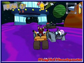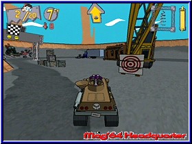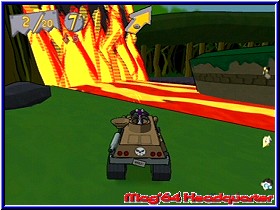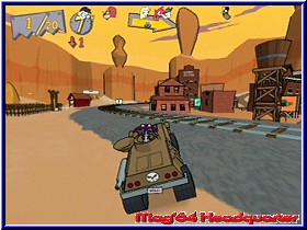 Es gibt im Spiel 4 verschiedene Themen und Hintergründe mit jeweils 3 einzelnen Leveln. Dabei könnt Ihr in allen Spielmodis immer nur die ersten Level jedes Theme's anwählen und müßt die Zielvorgaben erfüllen um das nächste freizuschalten. So findet Ihr euch in einer Wüste wieder, schlagt euch durch den Jungle, verbreitet in Transsylvanien Angst und Schrecken um am Ende auf einer Weltall Location loszulegen. Alle Level sind dabei abgrenzte und frei befahrbare Umgebungen. Der erste Spielmodus zeigt das Spielprinzip sehr deutlich. Beginnt ein Level werden alle Teilnehmer innerhalb der Location abgesetzt. Im Smack Modus muß der Spieler durch zerstören der Gegner immer wieder Punkte erreichen. Wer als erster z.b 500 davon hat darf sich als Sieger bezeichnen. Dabei könnt Ihr alle Spielmodis über die Settings beeinflussen. Stärke der Gegner bis hin zu den verfügbaren Waffen. Das Ungewohnte beginnt sofort beim starten des Levels. Der Cel Shading Look offenbart im Endeffekt eine Trickfilm Umgebung die einzig aus 2D Bauten in einer 3D Umgebung besteht. Das Wort Texturen hat in einem Cel Shading Spiel wenig zu suchen. Alles was Gebäude oder Umgebungen angeht besitzt meist nur eine Farbe. Dafür kennt Cel Shading keinerlei physikalischen Gesetze. Zumindest nicht in diesem Spiel. Sobald man selber Hand anlegen darf wird einem schnell bewußt das man umdenken sollte. Zunächst bei der Steuerung. Gas gegeben wird mit der R Taste und gebremst, so man dies überhaupt braucht mit der L-Taste. Dabei verformt sich das Fahrzeug live vor eurem Auge wie in einem Trickfilm. Lenkt Ihr also scharf nach links oder rechts biegt sich die vordere Hälfte des Wagens in die jeweilige Richtung. Dabei ist die Steuerung sehr direkt und schnell. Man gewöhnt sich schnell an sie und kommt damit gut zurecht. Jeder der Wagen ist mit Waffen ausgestattet. Schließlich ist das Ziel, die Gegner platt zu machen nicht mit netten Worten zu erreichen. Jeder Wagen hat eine eigene Waffe, die jederzeit und unendlich eingesetzt werden kann. Dazu kommen nun insgesamt 36 verschiedene Super Waffen. Diese werden wie in Mario Kart über entsprechende Schilder auf der Strecke augesammelt. Jetzt erscheint dafür rechts oben eine Anzeige welche der Waffen man hat und wie lange man sie einsetzen kann. Diese Waffen reichen von Bomben, über Kettensägen bis zu Helicopter Items samt MG. Auf jeden Fall äußerst abgedreht und nicht alltäglich. Über grüne und rote Panzer lacht Ihr hier nur. Einmal eingesammelt fährt nun wie wild durch die Level und könnt alles zerschneiden, wegbomben oder umfahren was einen in den Weg kommt. Ob nun Umgebung oder eben viel wichtiger, die Gegner. Diese versuchen das nun ihrerseits, wobei das Prinzip jeder gegen jeden besteht. Dabei sind alle Waffen animiert durch den Cel Shading Look. |