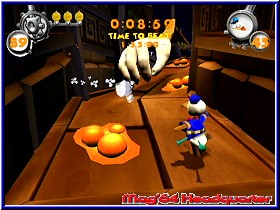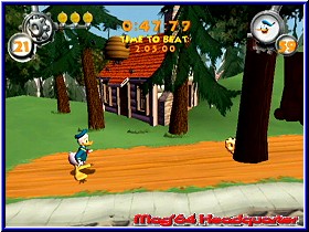 Von hier aus habt Ihr den Zugriff auf die verschiedenen Welten im Spiel, sowie einige Bonus Dinge, die neu sind und erst freigespielt werden müssen. Und hier kommen wir zum zweiten Kritikpunkt. Wie bei der Story sind auch die 4 Hauptwelten thematisch wie auf dem GBC, dem GBA und dem N64. So langsam wird es dann meiner Meinung nach Zeit für eine Generalüberholung der Locations. Vom Wald geht es also in die Stadt, danach in Gundels Gruselhaus bis zu Merlock's Tempel. Natürlich nun grafisch und technisch ein anderes Kaliber stört es mich trotzdem das man hier nichts komplett neues geboten bekommt. Die 4 Welten sind in sich in verschiedene Action Level unterteilt, sowie einen Endgegner. Dabei müssen die insgesamt 22 Level linear gespielt werden, also eines nach dem anderen. Das wurde aber nun wie vieles im Spiel schön umgesetzt. Denn Donalds Animationen, Bewegungen und Sprüche bei allen möglichen Aktionen lassen selbst die älteren schmunzeln. Hier merkt man Liebe zum Detail. Die reinen Action Level unterscheiden sich spielerisch in 3 verschiedene Varianten. Einzig Jump'n Run Feeling ist allen gemein. In der ersten Variante geht es ähnlich wie in Tarzan oder auch dem Vorgänger springend und laufend in die Tiefe des Screens auf exakt vorgegebenen Wegen. Dabei muß Donald wie auch in den anderen Leveln immer einen Endpunkt des Levels erreichen, wo er eine Plattform samt dem zu holenden Item findet. An Aktionen stehen Donald nur wenige Moves zur Verfügung. Neben dem einfachen Sprung besitzt er per zweimaligen A drücken den bekannten Doppelsprung, sowie per B Taste eine Angriffs Attacke. Wesentlich besser macht sich aber mit der Zeit die altbekannte Jumper Variante bei der man den Gegnern in den Leveln auf die Rübe oder ein anderes Körperteil springt. Diesen Gegnern weicht man entweder aus oder eliminiert sie auf die angesprochene Variante. Später im Spiel kann man aber auch Special Moves aktivieren wenn man 3 Gegner hintereinander trifft ohne den Boden zu berühren. Doch dazu später mehr. Neben dem Laufen und umkurven von Hindernissen ist natürlich das Sprungfeature besonders wichtig. Dabei haben die Entwickler gottseidank auf ein kleines Feature geachtet. Nämlich Donalds Schatten am Boden. Durch das Springen nach vorne in die Tiefe des Screens kann man sich bei Entfernungen arg verschätzen und landet in Abgründen oder sonstigen Fallen. Durch den Schatten sieht man aber ob Donald gerade über einer Plattform ist oder nicht. Da er in der Luft sehr gut zu steuern ist gelingt das gut. Wäre dieses Schatten Feature nicht, könnte man die gewaltige Kritik Keule schwingen. Geblieben ist ebenfalls Donalds Energieleiste. |