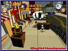 Die Vorgehensweise ist komplett gleich. Vom Schwierigkeitsgrad her hat man ein lösbares Spiel hinbekommen. Zu Beginn hat man noch wenig Leben, was den Spieler zur Vorsicht bei seinen Aktionen zwingt. Später im Spiel wird zwar die Umgebung schwerer, dafür hat man allerdings schon genug Leben. Vor allem Gundels Schloß und Merlock's Tempel sind anspruchsvoll, ohne aber den Spieler selber vor unlösbare Probleme zu stellen. Für die jüngere Zielgruppe, die das Spiel ja zweifelsohne hat ist er aber sehr gut und ausgewogen. Unterbrochen wird die gesamte Action immer durch die Sequenzen und Donald's Neffen. Und das ist dann zwar endlich mal was neues, aber trotzdem wenig erschöpfend. Denn schafft Donald einige Level erwarten ihn immer seine 3 Neffen in einer kleinen Kampfarena und er lernt einen der angesprochenen Special Moves. Diese über Tastenkombinationen auszuführenden Moves kann er nur nutzen wenn er 3 Gegner ohne Bodenberührung erwischt. Allerdings haben sie kaum Einfluß auf das Spielgeschehen. Am Anfang aus Neugier oft genutzt braucht man sie eigentlich nicht. Sie sind in meinen Augen kosmetisches Beiwerk und nicht mehr. Erst wenn man das Spiel durch hat und denkt, nun wäre alles vorbei wird man bei einem Blick auf sein Savegame stutzig. Knappe 40% des Spiels hat man dann nämlich erst gelöst. Parallelen zu Tarzan kommen jetzt. Denn nun könnt Ihr jedes Level nochmal in verschiedenen Challenges spielen, wobei dies einem Time Trial oder Highscore Modus ähnelt. Ihr müßt vorgegebene Werte unterbieten um jeweils spezielle Medaillen dafür zu erhalten. Erst wenn man das alles geschafft hat in den Action Levels darf man eine neues Level betreten. Alle eure Werte werden dabei gespeichert und sind jederzeit abrufbar bei Daniel Düsentrieb. Wer sowas mag kommt also zweimal auf seine Kosten. Wobei es jetzt ein wenig schwerer wird, da in den Leveln nun keine Rücksetzpunkte vorhanden sind. In meinen Augen aber nur von kurzer Dauer motivierend. Das Kernspiel an sich macht da wesentlich mehr Laune. Kommen wir zum technischen Teil und hier vor allem zur Grafik. Wer mal einen klitzekleinen Anflug von Cell Shading sehen will bekommt auch dies geboten. Während die Hintergrund Grafik sehr im Comic Stil gehalten ist erscheint bei einem Treffer die schon angesprochene Wolke um Donald, die klar zeigt was Cell Shading eigentlich ist. Ansonsten paßt die Grafik zum Spielinhalt und man sollte HighRes Vergleiche zu einem Starfox oder Star Wars schnell beiseite legen. Donald hat seinen eigenen Grafikstil. Bunt und verspielt wird der GameCube aber sicher nicht ausgereizt. Aber ebend passend zum Spielgeschehen. Etwas das auf dem GameCube in Mode kommt. |