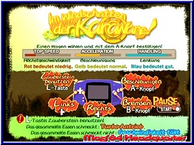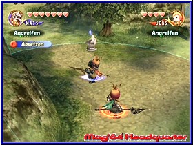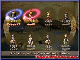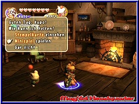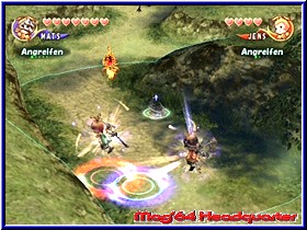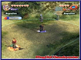 Zunächst sind die Grundvoraussetzungen recht klar definiert. Muß im GCN eine FFCC Disk schlummern, benötigt man im GBA kein Spiel. Alles was relevant ist wird für die Session auf den GBA geladen und dort ausgeführt oder verwaltet. Desweiteren braucht Ihr natürlich ein GBA Link Kabel für jeden angeschlossenen GBA. Denn auch eines reicht um das Link Feature, wenn auch nur in Teilen zu nutzen. Fangen wir mit der einfachsten Variante an. Spielt Ihr ein Einzelspiel ist der GBA ebenfalls schon nutzbar. Neben eurem GCN Controller wird der GBA also am 2. Controller Port angeschlossen. Nach dem Einschalten und dem Laden des eigenen Savegames dient der GBA wie seinerzeit beim guten Link als Radar der Umgebung. Das heißt betretet Ihr eine Location von der Weltkarte aus, wird die Location in seinem Grundriß auf den GBA geladen. Ihr seht auf dem GBA euren Charakter als farbigen Punkt und könnt auf jeden Fall weiter schauen wo die Wege weitergehen als auf dem GCN mit seiner limitierten Sichtweise. Barrieren werden dargestellt und unter dem Bildschirm die sogenannte Bonusaufgabe, die aber im Einzelspieler nicht weiter wichtig ist. Schade finde ich das auf dem Radar keine Kisten dargestellt werden. Einzig die Weg sind erkennbar und der Charakter wenn Ihr ihn bewegt. Hörbar hat man hier das Verlassen des Kelch Bereiches eingebaut und der GBA dann anfängt zu piepen. So vielleicht die schwächste Variante der Linkmöglichkeiten. Die zweite Variante wird möglich wenn Ihr ebenfalls allein spielt, aber nur den GBA als Controller einsteckt und gar keinen GCN Controller mehr verwendet. Erste Variante so ist ebenfalls das Anwählen des Einzelspieler Modi. Dabei ist aufgrund der Tastenbelegung ein normales Spielen auch mit dem GBA möglich. Unterschied zum GCN Controller ist zum einen das Pausenmenu. Mit dem GBA drückt man die Select Taste und wechselt auf dem GBA nun per B-Taste in das Pausenmenu, ohne das auf dem GCN irgendwas passiert. In diesem Pausenmenu habt Ihr nun alle Einträge wie auch per GCN Controller auf dem TV Screen. Zusätzlich zum Radar könnt Ihr die Kommandoliste einsehen, Gegenstände verwalten oder eure Briefe lesen. Ist dann alles eingestellt kann man per Select wieder zurück zum Spiel und weiterspielen. Ebenfalls und damit das erste mal möglich ist der Mehrspieler Modus auch mit nur einem GBA. Klingt unlogisch? Nicht ganz. Denn Ihr wählt hier zunächst auch wieder euer Savegame an, das natürlich das gleiche sein kann wie im Einzelspieler und steuert über den Weltenscreen wie gewohnt. Erster Unterschied ist das Fehlen von Mogy, der sonst immer den Kelch trägt in den Locations. Hier agiert Ihr vollkommen allein und müßt sowohl den Kelch tragen als auch kämpfen. Man merkt schnell das dies ja auch nicht Sinn der Sache ist. Allerdings wird ein weiteres Feature auch allein möglich. Die im Einzelspieler gefundenden Mogry Nester und deren Stempel bekommen hier ihre Bedeutung. Bei bestimmten Stempeln bekommt Ihr immer ein Minispiel freigespielt. Im Endeffekt ist es aber nur ein einziges Minispiel. Was euch dann immer als neues Minispiel angezeigt wird wenn Ihr mehrere Stempel bekommt sind Strecken von denen man mehrere freischalten kann. Geht man jetzt zu einem Mogry Nest das einem ein Minispiel freigeschaltet hat kann man dieses starten. Dabei wird auf dem GCN nur der Titelscreen eingeblendet und die Tastenbelegung. Die reine Action geht auf dem GBA ab. Nichts anderes als ein Rennspiel im Mario Kart Style erwartet euch hier. Steckt eben nur ein GBA im GCN spielt Ihr praktisch allein gegen 7 CPU Gegner. Verschiedene Strecken lang geht es dabei über 3 Runden um den Sieg. Eine Steuerung die zwar etwas träge wirkt, aber an Mario Kart durchaus erinnert gilt es Gegner zu ärgern in dem man auch hier Zauberkugeln aufsammelt oder durch Nahrungssysmbole das „Kart“, das hier euer Karawanengefährt ist schneller macht. Das einzige was mir hier nicht so gefällt ist die Tatsache das man für verschiedene Strecken eben auch erst zu den entsprechenden Mogry Nestern laufen muß. Gleich alle Strecken die man freigeschaltet hat anwählen ist nicht möglich. Außerdem dauert es ca. 15 Sekunden wenn man ein Rennen beendet und wieder zurück in das Spiel will. Was allein geht ist natürlich auch mit bis zu 4 Spielern per GBA möglich. Soweit alles nur mit einem GBA. Seine volle Stärke spielt das ganze mit 2 – 4 Spielern aus. Wahlweise aus den schon erstellten Charakteren wählt man aus oder man lädt einen Spieler über den Memcard Slot B ein mitzuspielen. Im Endeffekt ist es das gesamte Hauptspiel mit bis zu maximal 4 Spielern. Dabei ist es egal ob Ihr nun ein neues Spiel beginnt oder mittendrin ein Savegame aus dem Einzelspieler ladet. Sind z.b. 2 Leute am Spielen stecken nur 2 GBA Geräte am GCN. Der gewohnte GCN Controller spielt keine Rolle mehr. Seid Ihr beide im Spiel wird nun die obere rechte Ecke für den zweiten Charakter genutzt. Bei 4 Leuten also alle 4 Ecken. Im Vollbild bewegen sich dabei alle innerhalb eines Screens oder hier besser gesagt innerhalb des Kelchkreises. Wobei es hier schon den ersten Unterschied zum Einzelspieler gibt. Einer der Mitspieler muß immer die Rolle des guten Mogy übernehmen und den Kelch tragen. Kommen Gegner auf euch zu setzt man ihn dann ab und kämpft gemeinsam oder einer ist stark genug die Arbeit zu übernehmen. Es sind aber Kleinigkeiten die hier schon sehr gefallen. Drückt einer der Spieler nun mitten im Gefecht die Select Taste wechselt er praktisch in sein Inventory Menu und nimmt am Kampf nicht mehr Teil. Allerdings taucht nun kein Pausenscreen auf dem TV Bildschirm auf sondern der oder die anderen kämpfen einfach weiter und nur ein GBA Symbol in der Ecke des entsprechenden Spielers zeigt an das er kurz eine organisatorische Pause einlegt. In dieser Zeit kann der Spieler nun in seinem Inventory Menu machen was er will um z.b. einen Zauber zu erschaffen oder seine Kommandoliste zu belegen. Die anderen merken davon garnichts, sondern