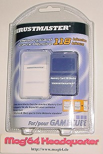 | Mit dieser Karte steigt nun auch Thrustmaster in den 8MB Markt ein. Dabei ist diese Karte im Moment die größte in der Thrustmaster Range. Diese als normale und nicht als Fifa Version erhältliche Karte bietet dabei aber wie der kleine Bruder eine kleine Plastikhülle in der Packung, in die man die Karte immer verstauen kann. Etwas das ruhig alle Hersteller überdenken sollten. Kritik gibts gleich mal für Packung. Auf der Rückseite werden einige Spiele samt ihrer benötigten Seiten aufgelistet. Wenn dann sollten diese Zahlen auch stimmen. Bei TH3 stehen 6 statt 11 Seiten wenn man die Editoren des Spiels mit einrechnet und Rogue Leader und Star Wars II stehen gleich mal als 2 eigenständige Spiele mit je 3 Seiten. Aber das nur am Rande. Über die Qualität der Karte sagt dies natürlich nichts aus. Auch die Thrustmaster 8MB Karte bietet wie die Vidis Karte 123 statt logischer 118 Seiten auf der Karte. Die Karte die im GCN Purple auf den Markt kommt ist funktional ohne Probleme zu handhaben. Auch bei großen Files wie Replays oder Snapshots ist sie nicht langsamer als das Original. Auch Speichern, Kopieren, Löschen Durchgänge sind ohne Probleme vonstatten gegangen. Wer also auf eine 8MB Karte schaut findet hier eine etwas billigere Karte die auch eine Plastikhülle bietet. King of the Ring bleibt aber auch jetzt weiterhin die große bigben Karte. | ![]()