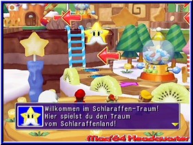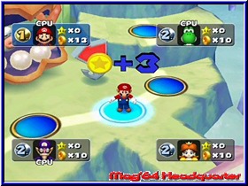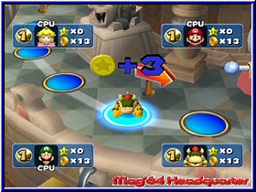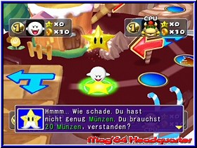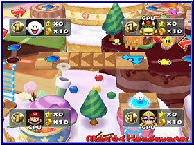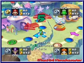 Wählt man den Party Modus also an sucht man zunächst vergebens nach dem guten Toad, der ja sonst immer den großen Zampano markiert hat. Was aber auch seinen Grund hat. Erste Neuheit hier ist die Wahl ob man den üblichen Jeder gegen Jeden Modus spielen möchte oder aber im Team 2-2 zocken will. Damit ist kein Minispiel gemeint, sondern das bei 4 menschlichen Spielern jeweils 2 miteinander über das gesamte Brett wuseln und Sterne wie Münzen addiert werden. Danach folgt wieder die Charakter Auswahl. Hier gibt es die nächste Neuerung. Zunächst sind nun 10 Recken anwählbar. Neben Toad sind Mini Bowser und Buu Huu als Charaktere wählbar. Was aber auch heißt es fehlt hier jemand. Genau, denn Donkey Kong ist im Party Modus nicht mehr dabei, da er nun auf den Brettern selber eine neue Aufgabe bekommen hat. Neben der Wahl der menschlichen Spieler wählt Ihr bei weniger als 4 Mitstreitern die Computergesteuerten Charaktere aus. Ihr könnt wieder jedem einen von anfänglich 3 Schwierigkeitsgraden zuweisen. Mario Party 5 bietet aber noch einen Extra Modus, der das leidige KI Thema ein wenig verändert. Doch dazu später mehr. Jetzt wählt Ihr euer gewünschtes Spielbrett aus. Etwas das immer wieder viele interessiert. Zu Beginn sind 6 Bretter anwählbar, die sich aber nun nicht mehr in Schwierigkeitsgrade aufteilen. Warum auch. Zusätzlich kann man ein 7. Brett freispielen und nutzen. Allerdings erst wenn man den Story Modus geschafft. Doch auch dazu später mehr. Nach der Brettwahl folgt immer die Einstellung für das aktuelle Spiel. Beibehalten wurde die Rundenwahl, die wieder bei 10 beginnt und in 5er Schritten bis zu den bekannten 50 Runden betragen kann. Ihr könnt wieder Überraschungsfelder aktivieren, die plötzlich auf dem Spielbrett per Zufall einen Stern oder Münzen aktivieren. Dazu ob alle Minispiele erlaubt sein sollen und ob bestimmte Spieler ein Handicap erhalten sollen. Aber ich finde das hat in einem Mario Party Spiel nichts zu suchen. Wer möchte kann sich die Regeln eines Mario Party Spiels wieder in einem Tutorial anschauen. So ausgestattet kann das Spiel eigentlich losgehen. In einem Zoom View wird auf das gewählte Brett geschwenkt und die 4 Möchtegern Party Stars befinden sich am Start Feld des Brettes. Ziel ist es natürlich auch in diesem Spiel wieder durch das Erringen von Sternen ein Brett zu gewinnen. Er wird wieder in der Grundversion für 20 Münzen gekauft, sobald der Spieler ein derartiges Feld erreicht. Ebenfalls gleich geblieben ist die Art und Weise des Vorankommens über einen Würfel, der sich über dem Kopf des Charakters dreht wenn er dran ist. Wie im 4er auch springen die Helden etwas verzögert nach oben, was eine geplante Zahl der möglichen Werte 1-10 schwerer macht. |