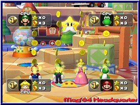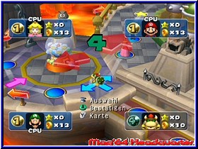 In der Geschichte des Mag'64 gibt es trotz Stress und täglichen Verpflichtungen immer wieder etwas das nun nun schon seit Jahren immer wieder Freunde und Bekannte zusammenführt. Spielnächte die gerne mal abends beginnen und beim Morgengrauen in die zweite Runde gehen. ;-) Besonders in den kalten Tagen wenn es draußen stürmt, regnet oder schneit gibt es nichts schöneres als den Pizza Service kommen zu lassen und sich auf der Couch mal wieder spielerisch zu vergnügen. Dabei spielen immer spezielle Games ein Rolle. Je nach Stimmung immer mal verschieden hat es immer ein Titel geschafft uns länger am Bildschirm zu halten und mal wieder auszutesten bei wieviel Sternen die Freundschaft auf die Probe gestellt wird. ;-) So war das auch beim ersten Mario Party Titel für den GameCube. Allerdings und das spürte man damals in der Runde hatte der 4er doch einige Schwächen, die nicht wegzureden waren und wenn Mario Party angesagt war dazu führte das nach wie vor der 3er im Schacht des N64 landete. Als Nintendo dann den fünften Teil ankündigte war man erneut voller Hoffnung und Vorfreude das man diesmal wieder zu alten Stärken findet und vor allen die kleinen technischen Dinge wie Ladezeiten im Spiel ändert. Nun liegt der 5.Teil vor und ist ausgiebig gespielt. Eines kann man auf jeden Fall sagen. Den 4er braucht niemand mehr und der 5.Teil ist in vielen Dingen sehr verbessert worden. Ob er es aber mit dem 3er aufnehmen kann und ob der Spielspaß an sich stimmt soll euch der folgende Test zeigen. Das komplett deutsche Game für 4 Spieler besitzt wieder keinen 60Hz Modus, was an sich ja kein Problem sein sollte. Die Memory Card wird mit 5 Seiten dagegen human belegt und gestattet euch erneut das nutzen von 3 verschiedenen Savegames in denen alle Erfolge gespeichert werden. Danach gelangt Ihr auf das Hauptmenu, das euch nun durch mehrere Sternencharaktere durch das Spiel führt. Jeder Stern bringt euch zu einem Bereich des Spiels. Das reicht vom bekannten Party Modus, dem Story Modus, dem Super Duell, dem Super Bonus, den Minispielen sowie den Optionen. Das heißt das diesmal wesentlich mehr Spielmodi enthalten sind, die man teilweise erst freispielen muß oder gewisse Aufgaben dafür erledigt. Von daher kann es der 5er auch mit dem 3er aufnehmen, da vor allem der Single Player aufgewertet wurde. Die Optionen bieten euch Zugriff auf Rumble und Soundeinstellungen, die auch Surround zulassen. Dazu gibt es wieder die Statistiken und eine Übersicht über die Minispiele die man im Spiel findet. Auch hier sollte sich einiges geändert haben. Wie immer möchte ich den Test mit dem Party Modus beginnen. Auch wenn der Single Player erweitert wurde ist und bleibt Mario Party ein Spiel das mehrere menschliche Spieler immer noch am meisten unterhält.