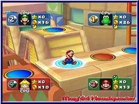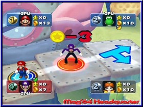 10 Felder vom eigenen Standpunkt entfernt kann man wohin man will die Kapsel schmeißen. Im Falle eines Pilzes verwandelt sich nun dieses Feld auf das man die Kapsel geworfen hat. Tritt einer der Charaktere dort drauf wird bei ihm der Pilz aktiviert. Allerdings und das ist das schöne der Kapseln sind wesentlich mehr böse Dinge darin enthalten, die dem Spiel äußerst gut tun. Warum nicht mal eine Kettenhundkapsel werfen. Tritt ein Charakter drauf darf man sich über dessen Sterne oder Münzen freuen. Oder man erschafft ein sogenannten Kugelwilli Feld. Tritt man drauf reitet man auf diesem Geschoß und jeder Spieler dessen Weg Ihr kreuzt gibt 30 Münzen an euch ab. Die Einteilung in Gute wie Böse Dinge um das mal einfach auszudrücken ist ausgewogen und wertet das Spiel vor allem bei 50 Runden extrem auf. Da 6 dieser Kapselapparate auf den Brettern vertreten sind und unendlich Kapseln bieten kann man sich ja vorstellen was bei 4 Spieler geworfen wird. Man kann es auch ablehnen einen Kapsel zu nehmen, aber wer einmal durch eine Kapsel an die Sterne seines Konkurrenten gekommen ist weiß das Feature sehr zu schätzen. Auch wurde in Sachen extremer Gemeinheiten gegen die Mitspieler aufgerüstet. Auch wenn Buu Huu zum Sterneklau nicht mehr da ist bleibt das weiterhin möglich. Auch etwas das mir sehr gefällt. Die letzten 5 Runden sind ebenfalls aufgewertet worden. Erneut wird bei einem Treffen 2er Charaktere ein Duell ausgerufen. Hier könnt Ihr z.b. alle Münzen oder Sterne setzen. Zumindest soviel wie der Gegner hat. Gewinnt Ihr das spezielle Minispiel drüft Ihr alles einstreichen und könnt so ein Spiel nochmal entscheiden. Was alles im Endeffekt bedeutet das die Bretter anfangs was die reinen Lauffelder angeht meist nur in Blau und Rot eingeteilt sind. Je länger die Runden die man spielt um so aufregender wird es. Von daher ist der 5er eine extreme Verbesserung. Gerade Dinge in denen man Münzen verliert oder Sterne oder sonstwie ganz schön der Gelackmeierte ist sind wesentlich mehr vorhanden. Dabei alles mehr auf Glück und Zufall aufgebaut durch die Kapseln erhöht das den Spielspaß. Das man aber auch sein Glück planen kann liegt natürlich wieder an der Würze des Spiels - den Minispielen. Mit 74 Minispielen wurde MP5 endlich wieder mit einer ordentlichen Anzahl ausgestattet. Wieder eingeteilt in 4P, 1-3 oder 2-2 gibt es dazu die Duell Spiele, die auch im Story Modus eine große Rolle spielen, sowie die Kampfspiele in denen wieder bis zu 50 Münzen von jedem eingezogen werden und die ersten beiden mächtig absahnen bis hin zu den neuen DK und Bowser Mini Games, die man durch spezielle Felder aktiviert. Wieder muß man jedes Spiel einzeln freispielen, da alle beim berühmten Minispiel Roullette als Fragzeichen auftauchen. Auch hier muß man ein Kompliment aussprechen. |
