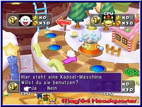 Hat ein Charakter gewürfelt läuft er diesen Zahlenwert auf dem Brett ab. Gleich geblieben ist ebenfalls die Anzeige der Stats eines jeden Mitstreiters. In den jeweiligen Ecken des Spiels findet man so neben dem Kopf die Anzahl der Sterne und Münzen. So langsam beginnen aber auch die Neuheiten und Verbesserungen im Spiel. Das leidige Thema Ladezeiten ist bei weitem nicht mehr so tragisch wie im 4er. Zwar gibt es immer wieder Momente, vor allem bei den CPU Gegnern wo man gerne mal die kurzzeitig warten muß, aber im gesamten spielt sich das Game wesentlich flüssiger. Allein durch die Einstellung Schnell in Sachen Sachen Textgeschwindigkeit im Pausenmenu kann man viel erreichen. Gerade in Sachen CPU Gegner. Was ebenso an vielen anderen Facetten liegt. Zum einen wissen endlich die Bretter wieder mehr zu gefallen und sind in meinen Augen an den 3er angelehnt. Vor allem sollte sich zeigen das die Interaktiviät auf den Brettern, durch Laufen ausgelöste Aktionen und Mechanismen wieder mehr enthalten sind. Dazu die Höhenunterschiede, was die Bretter zum einen wieder größer macht und so einfach mehr Platz für Gemeinheiten, nützliches und auch unsinniges bietet. Hier bin ich mit dem 5er zufrieden. 2 Dinge fallen schnell auf die garnicht mehr enthalten sind. Es gibt weder einen Shop, noch Buu Huu als Ereignis auf den Brettern. Das heißt kaufen tut Ihr nichts mehr und auch per Buu Huu Sterne und Münzen klauen ist nicht mehr drin. Nun könnte man sagen damit nimmt man dem Spiel etwas Gemeinheit, die bei den anderen Spielern je nachdem für gewisse Reaktionen gesorgt hat. ;-) Hier haben sich die Entwickler etwas neues einfallen lassen. Eines vorweg. Alles was es früher gab ist auch jetzt wieder enthalten. Sogar noch einiges mehr, das nur jetzt anders verpackt und umgesetzt ist. Vergleichbar mit dem Shop sind jetzt auf jedem Brett 6 sogenannte Kapselfelder vorhanden. Tritt man auf das Feld nach dem Würfeln steht man vor einem Apparat, in dem kleine Kugeln herumliegen. Man wird gefragt ob man eine Kapsel möchte. Bejaht man dies wird per Zufall eine ausgewählt für die man nichts bezahlt. Maximal 3 Kapseln dürft Ihr tragen. Im Endeffekt sind die Kapsel das was man früher kaufen konnte und bieten dazu viele neue Ereignisse in sich. Es gibt im Spiel immerhin 28 Kapsel Varianten!, die wenn man sie bekommen hat auch einen Namen tragen. Diese Kapseln bieten nun von bekannten Dingen wie Pilzen oder Münzblöcken reichlich Ereignisse, die auch völlig neu angewandt werden. Einfaches Beispiel ist eine Münzblock Kapsel. Diese kann man auf sich selber anwenden, bezahlt bei der Benutzung 5 Münzen Gebühr und bekommt sofort den Inhalt der Münzbox. So bezahlt man also dennoch dafür. Zweite Variante ist allerdings das man die Kapseln auf ein normales Würfelfeld schmeißen kann.